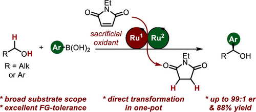 In this Letter, we report the enantioselective synthesis of secondary benzylic alcohols and diarylmethanols by α-arylation of primary aliphatic and benzylic alcohols under sequential catalysis. The strategy integrates a Ru-catalyzed hydrogen transfer oxidation and a Ru-catalyzed nucleophilic addition in a one-pot fashion. The method can be applied to various alcohols and aryl nucleophiles tolerating a range of functional groups, including secondary alcohols, ketones, alkenes, esters, NH amides, tertiary amines, aryl halides, and heterocycles. Overall, the study shows the potential of multicatalysis to enable transformations that are challenging for classic catalysis.